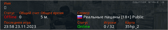 Играет на Counter Strike 1.6 сервере. Страна: РоссияПервый раз замечен 23:56 23.11.2023