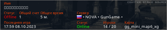 Играет на Counter Strike Source сервере. Страна: РоссияПервый раз замечен 17:55 08.10.2023