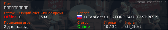 Играет на Team Fortress 2 сервере. Страна: РоссияПервый раз замечен 22:51 07.03.2026