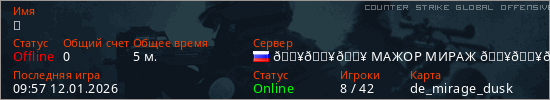 Играет на Counter Strike Global Offensive сервере. Страна: РоссияПервый раз замечен 09:55 12.01.2026
