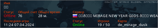 Играет на Counter Strike Global Offensive сервере. Страна: РоссияПервый раз замечен 23:00 19.03.2024