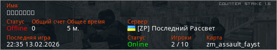 Играет на Counter Strike 1.6 сервере. Страна: УкраинаПервый раз замечен 22:31 13.02.2026