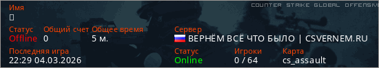 Играет на Counter Strike Global Offensive сервере. Страна: РоссияПервый раз замечен 22:04 04.03.2026