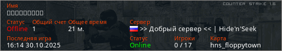 Играет на Counter Strike 1.6 сервере. Страна: РоссияПервый раз замечен 16:05 21.08.2025
