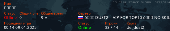 Играет на Counter Strike Global Offensive сервере. Страна: РоссияПервый раз замечен 00:49 08.01.2025