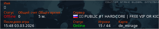 Играет на Counter Strike Global Offensive сервере. Страна: РоссияПервый раз замечен 15:31 03.03.2026