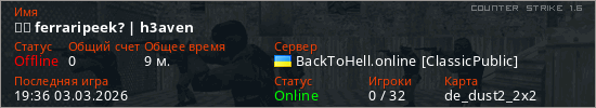 Играет на Counter Strike 1.6 сервере. Страна: УкраинаПервый раз замечен 14:13 17.02.2026