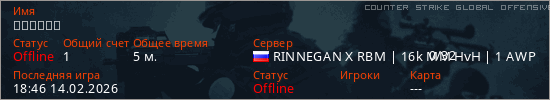 Играет на Counter Strike Global Offensive сервере. Страна: РоссияПервый раз замечен 18:42 14.02.2026
