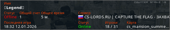 Играет на Counter Strike 1.6 сервере. Страна: РоссияПервый раз замечен 18:30 12.01.2026
