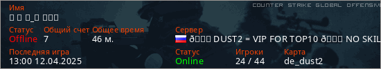 Играет на Counter Strike Global Offensive сервере. Страна: РоссияПервый раз замечен 12:20 16.01.2025