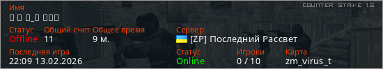 Играет на Counter Strike 1.6 сервере. Страна: УкраинаПервый раз замечен 21:42 13.02.2026