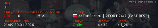 Играет на Team Fortress 2 сервере. Страна: РоссияПервый раз замечен 21:10 20.01.2026