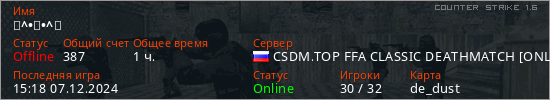 Играет на Counter Strike 1.6 сервере. Страна: РоссияПервый раз замечен 10:02 04.07.2022