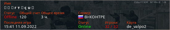 Играет на Counter Strike 1.6 сервере. Страна: РоссияПервый раз замечен 11:41 12.03.2020