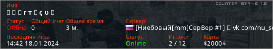 Играет на Counter Strike 1.6 сервере. Страна: РоссияПервый раз замечен 14:42 18.01.2024