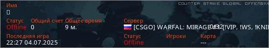 Играет на Counter Strike Global Offensive сервере. Страна: РоссияПервый раз замечен 20:56 27.06.2025