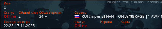 Играет на Counter Strike Global Offensive сервере. Страна: РоссияПервый раз замечен 21:18 22.10.2025