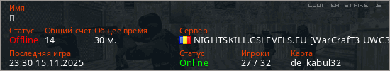 Последний раз был в сети 23:30 15.11.2025 Игрок с таким ником замечен на 30 серверах