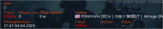 Играет на Counter Strike Global Offensive сервере. Страна: СШАПервый раз замечен 20:42 04.04.2026