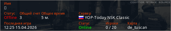 Играет на Counter Strike Source сервере. Страна: РоссияПервый раз замечен 12:14 15.04.2026
