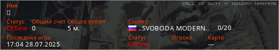 Играет на Call of Duty 4: Modern Warfare сервере. Страна: РоссияПервый раз замечен 16:45 28.07.2025