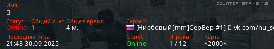 Играет на Counter Strike 1.6 сервере. Страна: РоссияПервый раз замечен 21:41 30.09.2025