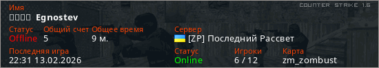 Играет на Counter Strike 1.6 сервере. Страна: УкраинаПервый раз замечен 20:28 13.02.2026