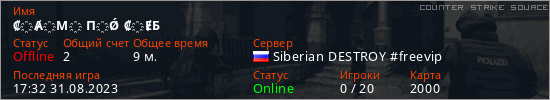 Играет на Counter Strike Source сервере. Страна: РоссияПервый раз замечен 16:22 31.08.2023