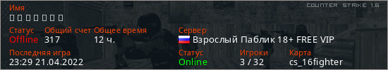 Играет на Counter Strike 1.6 сервере. Страна: РоссияПервый раз замечен 23:35 17.12.2019
