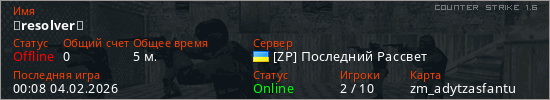 Играет на Counter Strike 1.6 сервере. Страна: УкраинаПервый раз замечен 00:01 04.02.2026
