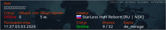 Играет на Counter Strike Global Offensive сервере. Страна: РоссияПервый раз замечен 11:23 03.03.2026