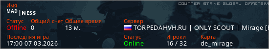 Играет на Counter Strike Global Offensive сервере. Страна: РоссияПервый раз замечен 19:25 05.03.2026