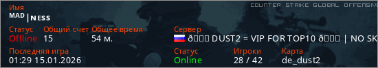 Играет на Counter Strike Global Offensive сервере. Страна: РоссияПервый раз замечен 03:03 30.12.2024