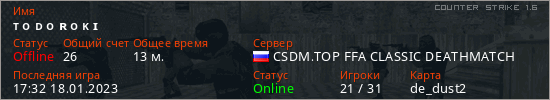 Играет на Counter Strike 1.6 сервере. Страна: РоссияПервый раз замечен 17:21 18.01.2023