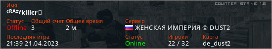 Играет на Counter Strike 1.6 сервере. Страна: РоссияПервый раз замечен 21:39 21.04.2023