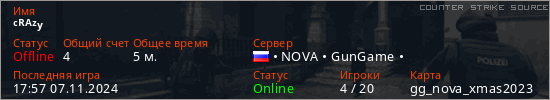 Играет на Counter Strike Source сервере. Страна: РоссияПервый раз замечен 17:47 07.11.2024