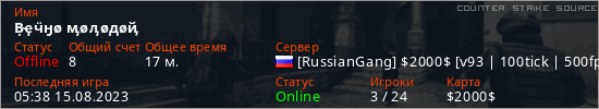 Играет на Counter Strike Source сервере. Страна: РоссияПервый раз замечен 18:28 02.06.2023