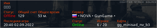Играет на Counter Strike Source сервере. Страна: РоссияПервый раз замечен 19:49 02.09.2022
