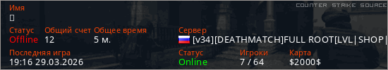 Играет на Counter Strike Source сервере. Страна: РоссияПервый раз замечен 19:14 29.03.2026