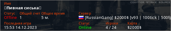 Играет на Counter Strike Source сервере. Страна: РоссияПервый раз замечен 15:42 14.12.2023