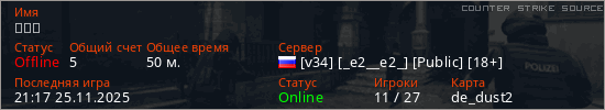Играет на Counter Strike Source сервере. Страна: РоссияПервый раз замечен 22:14 19.11.2025