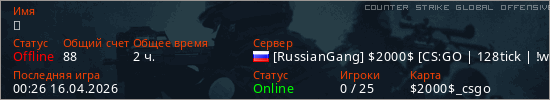 Играет на Counter Strike Global Offensive сервере. Страна: РоссияПервый раз замечен 14:09 04.04.2026