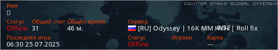 Играет на Counter Strike Global Offensive сервере. Страна: РоссияПервый раз замечен 09:55 18.06.2025
