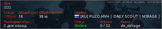 Играет на Counter Strike Global Offensive сервере. Страна: РоссияПервый раз замечен 02:45 16.09.2025