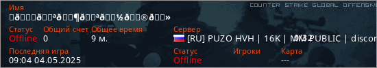 Играет на Counter Strike Global Offensive сервере. Страна: РоссияПервый раз замечен 11:50 12.04.2025