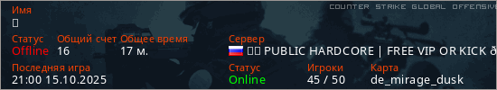 Играет на Counter Strike Global Offensive сервере. Страна: РоссияПервый раз замечен 06:26 22.06.2025