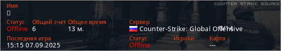 Играет на Counter Strike Source сервере. Страна: РоссияПервый раз замечен 23:56 06.09.2025