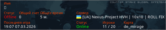 Играет на Counter Strike Global Offensive сервере. Страна: УкраинаПервый раз замечен 19:03 07.03.2026