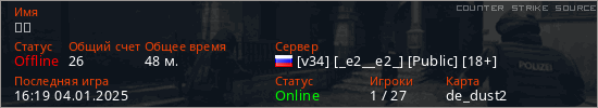 Играет на Counter Strike Source сервере. Страна: РоссияПервый раз замечен 18:38 24.12.2024