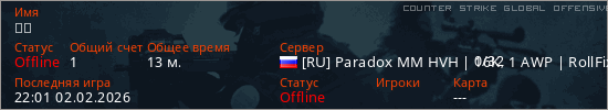 Играет на Counter Strike Global Offensive сервере. Страна: РоссияПервый раз замечен 21:10 24.01.2026